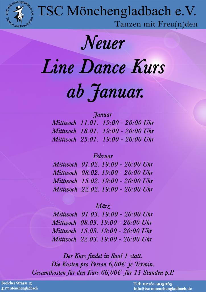 Der TSC Mönchengladbach bietet wieder 11 neue Line Dance Termine vom 11. Januar bis einschl. 22. März 2023 an.