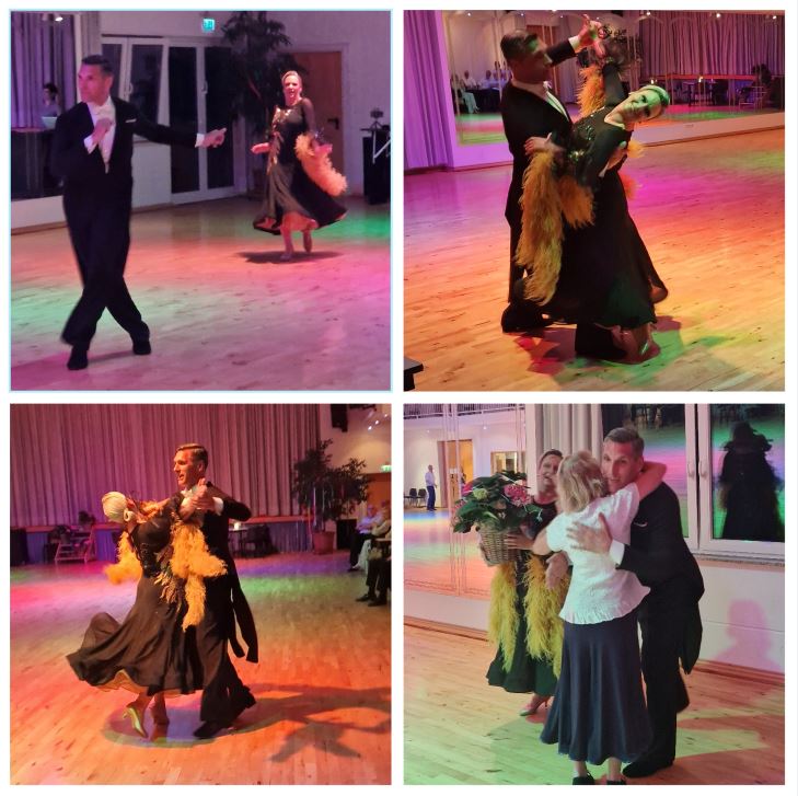Anschließend ließen sie sich auch nicht bitten, noch einen kräftezehrenden Quickstepp als Zugabe zu zeigen. Gäste und vereinseigene Paare waren begeistert und belohnten das Paar mit großem Applaus, Blumen und kulinarischem Geschenk-Gutschein.