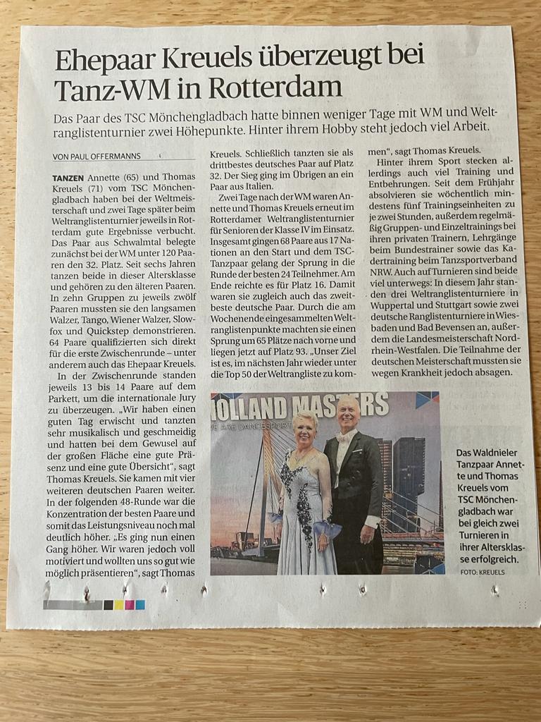 An Wochenende vom 13.-15.10.2023 fand im Rahmen der Holland Masters im Top Sportzentrum Rotterdam die Weltmeisterschaft im Standardtanzen der Altersgruppe Senioren IV ( Mindestens ein Partner 65 Jahre alt, der andere mindestens 60 Jahre alt) statt. Unser Turnierpaar Annette und Thomas Kreuels, freute sich, an dieser Weltmeisterschaft am 13.10.2023 teilzunehmen.